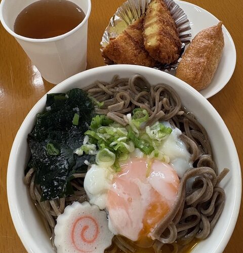 本日の昼食提供は、月見そば、コロッケ、稲荷寿司、チョコミント…