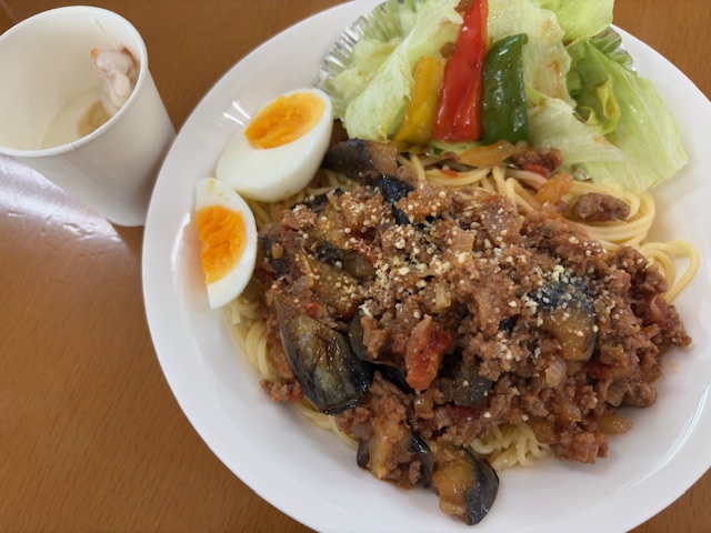 本日の昼食提供は、スパゲッティミートソース、サラダ、マンゴー…