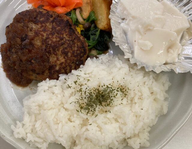 本日の昼食提供は、ハンバーグ、ほうれん草のソテー、人参の甘酢…