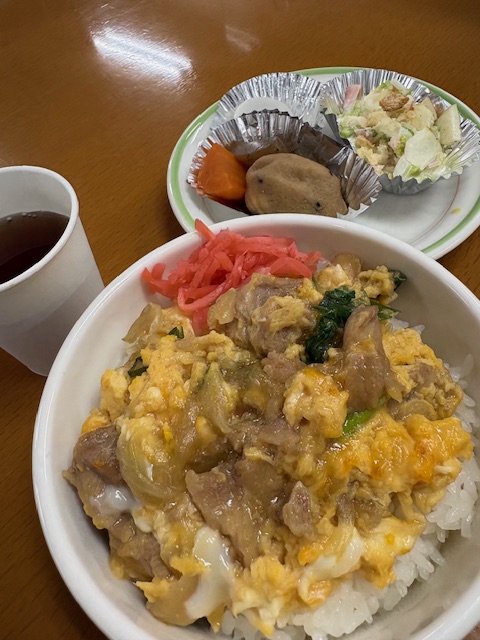 本日の昼食提供は、親子丼、白菜とりんごのサラダ、煮物、チョコ団子でした!