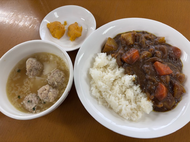 本日の昼食提供は、チキンカレー、肉団子スープ、スイートポテト でした!