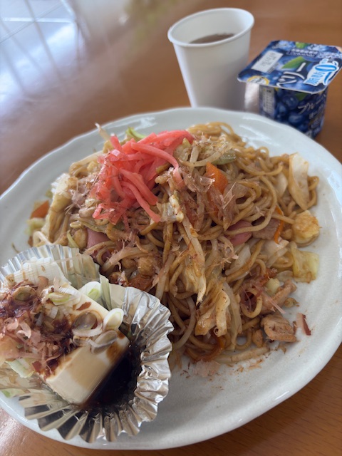 本日の昼食提供は、ソース焼きそば、冷奴、ヨーグルトでした!