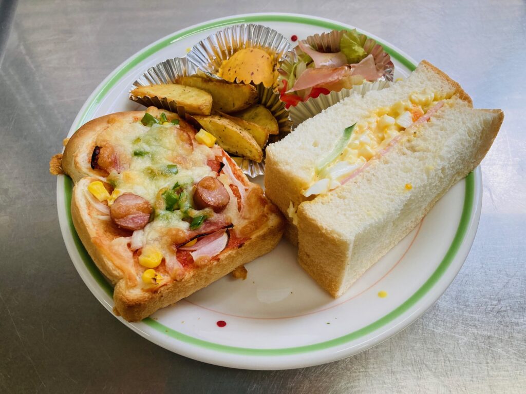 せせらぎのオーブンでこんがり焼いたピザトーストはカリカリ、たまごサンドは辛子が効いていとても美味しかったです🥪