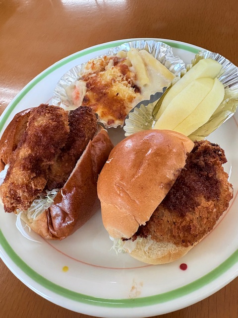 8月20日の昼食提供は、カツサンド、コロッケサンド、グラタン、りんごでした!
