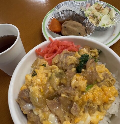 本日の昼食提供は、親子丼、白菜とりんごのサラダ、煮物、チョコ…