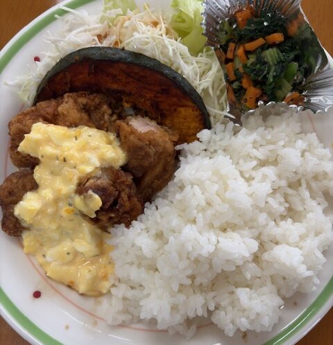 本日の昼食提供は、チキン南蛮、ほうれん草の胡麻和え、カボチャ…