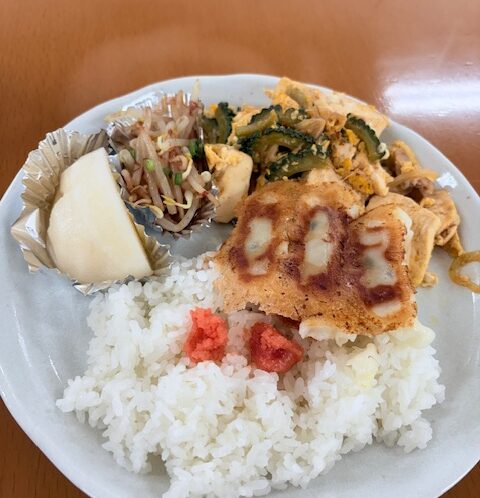 本日の昼食提供は、ゴーヤチャンプル、餃子、もやしのナムル、明…
