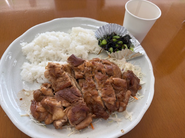 本日の昼食提供はチキンステーキ、枝豆の塩昆布和え、サラダ、ア…