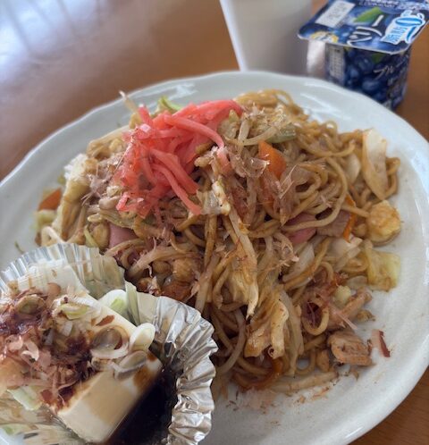 本日の昼食提供は、ソース焼きそば、冷奴、ヨーグルトでした! …