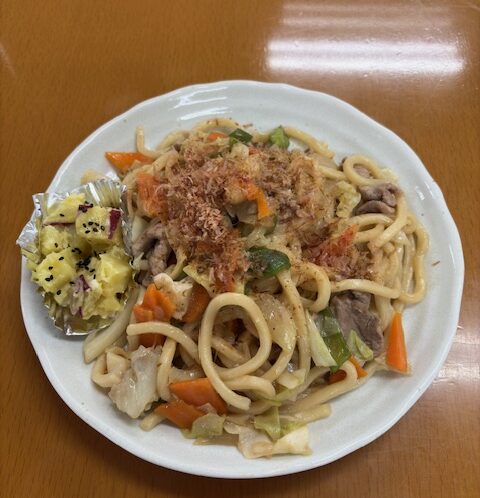 本日の昼食提供は、焼うどん、さつまいものサラダ、アイスでした…
